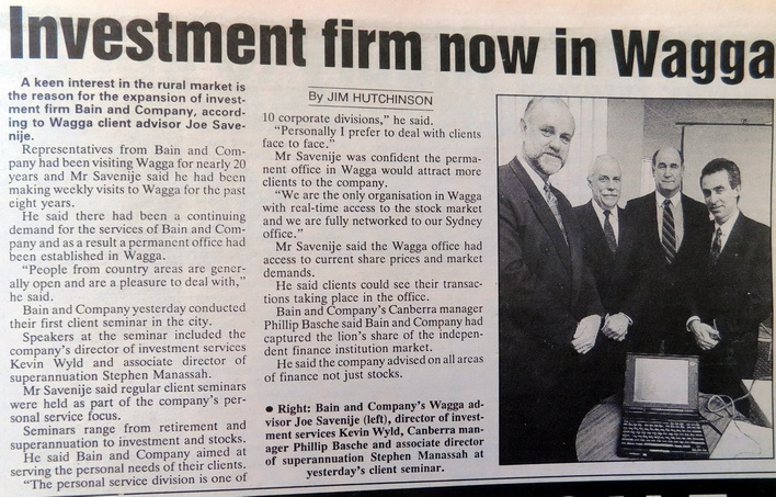 - Investment firm Bain and Company has established a local Wagga office with local client advisor, Joe Savenije.