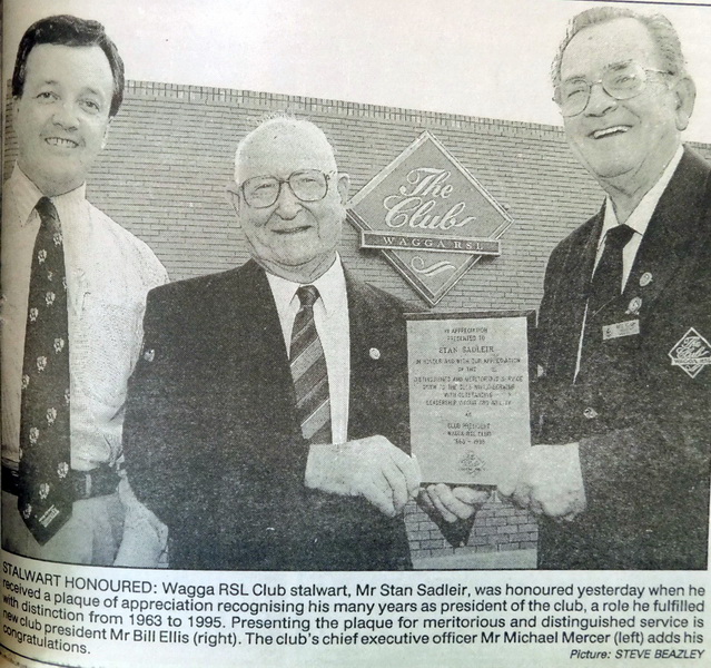 - Stan Sadlier was presented with a plaque recognising his service to the club as president from 1963 to 1995 by new president, Bill Ellis.