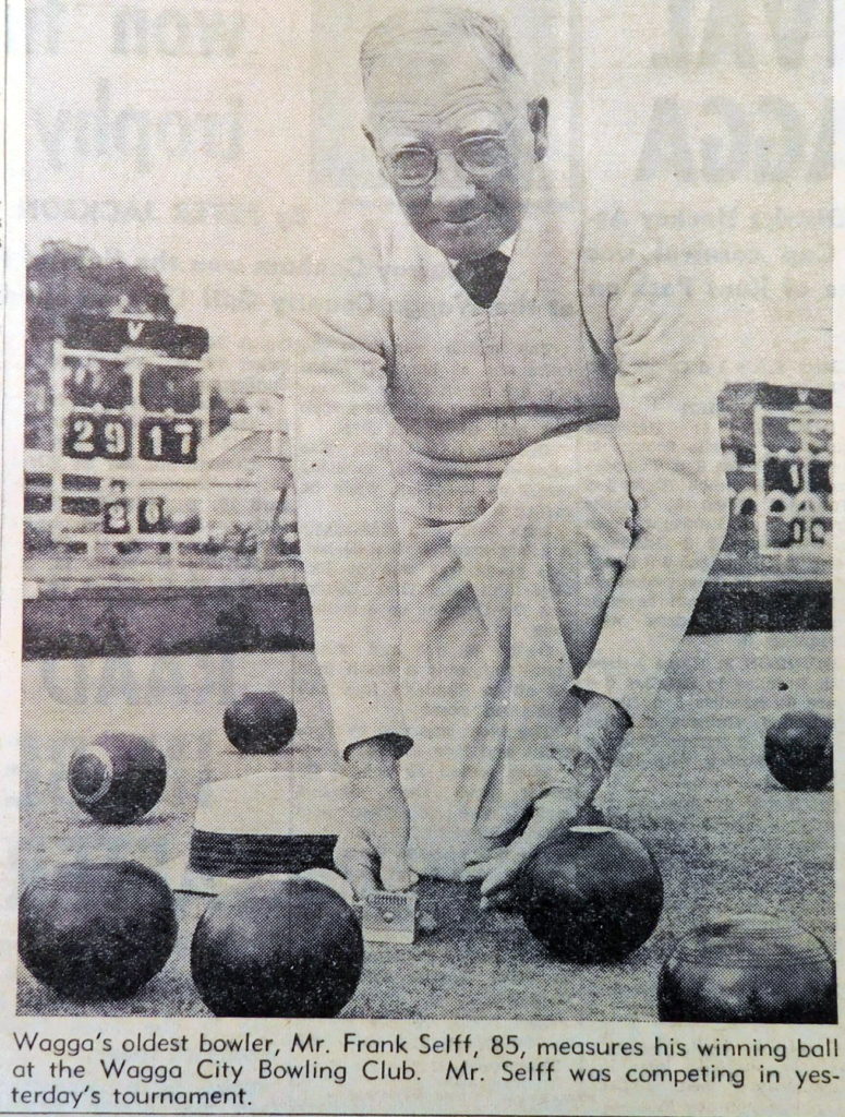 - Wagga’s oldest bowler, Mr Frank Selff, 85 is pictured in the Daily Advertiser measuring his winning ball in this week’s tournament.