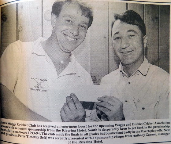 - The Riverina Hotel has renewed its sponsorship deal with South Wagga Cricket Club with hotel manager Anthony Gaynor presenting a cheque to club president, Peter Timothy.