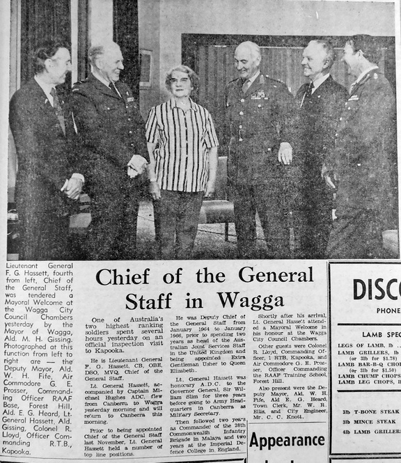 • Lieutenant General F G Hassett, Chief of the General Staff was tendered a Mayoral Welcome by Wagga’s Mayor, Ald M H Gissing during a visit to Wagga.