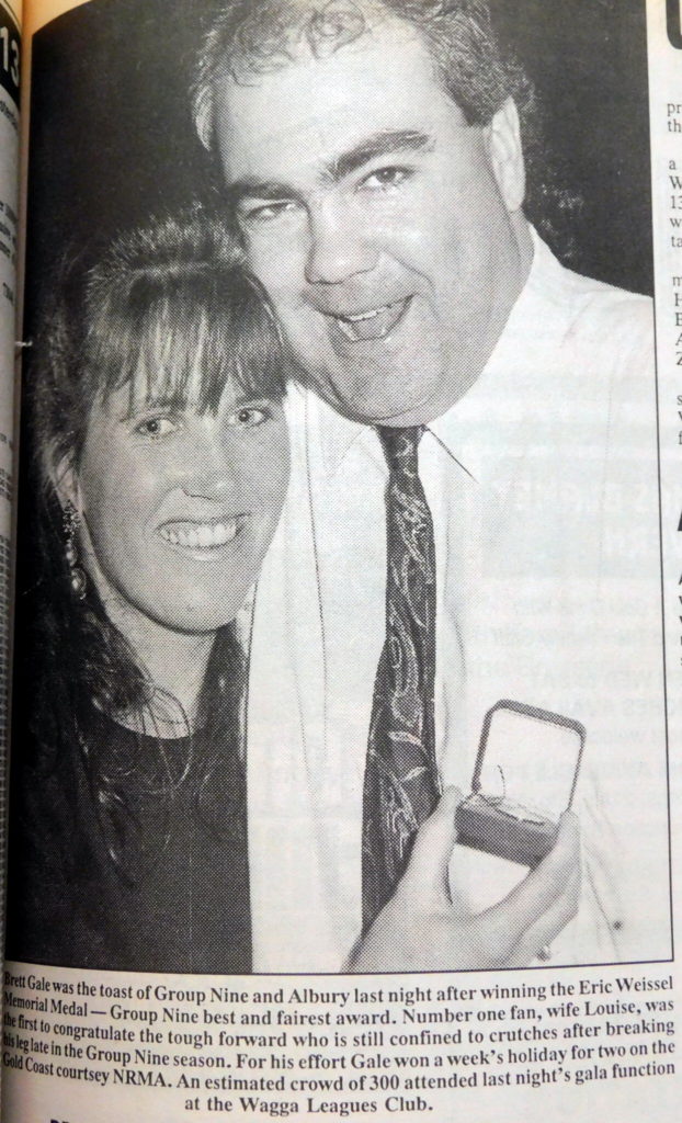 · Brett Gale won Group Nine Rugby Leagues best and fairest award, the Eric Weissel Memorial Medal at a gala function attended by 300 people at the Wagga Leagues Club.