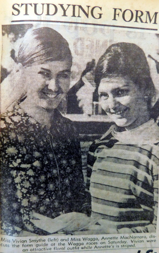 · Miss Vivian Smythe and Miss Wagga, Annette McNamara were pictured in the Daily Advertiser discussing the form guide at the Wagga races on Saturday.