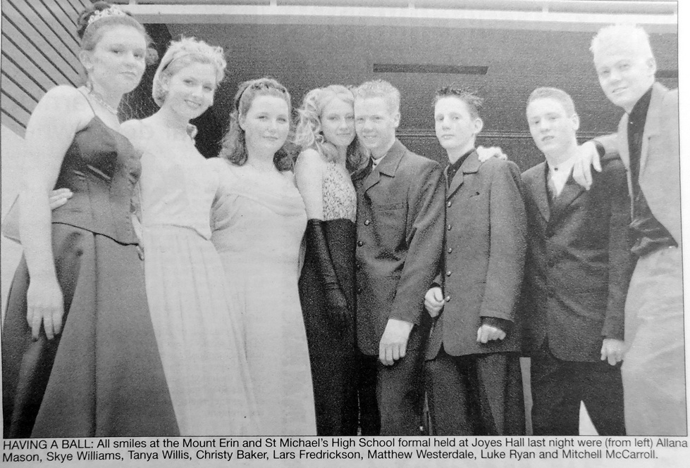 - Allana Mason, Skye Williams, Tanya Willis, Christy Baker, Lars Frederickson, Matthew Westerdale, Luke Ryan and Mitchell McCarroll were among those attending the Mount Erin and St Michael’s High School formal held at Joyes Hall.