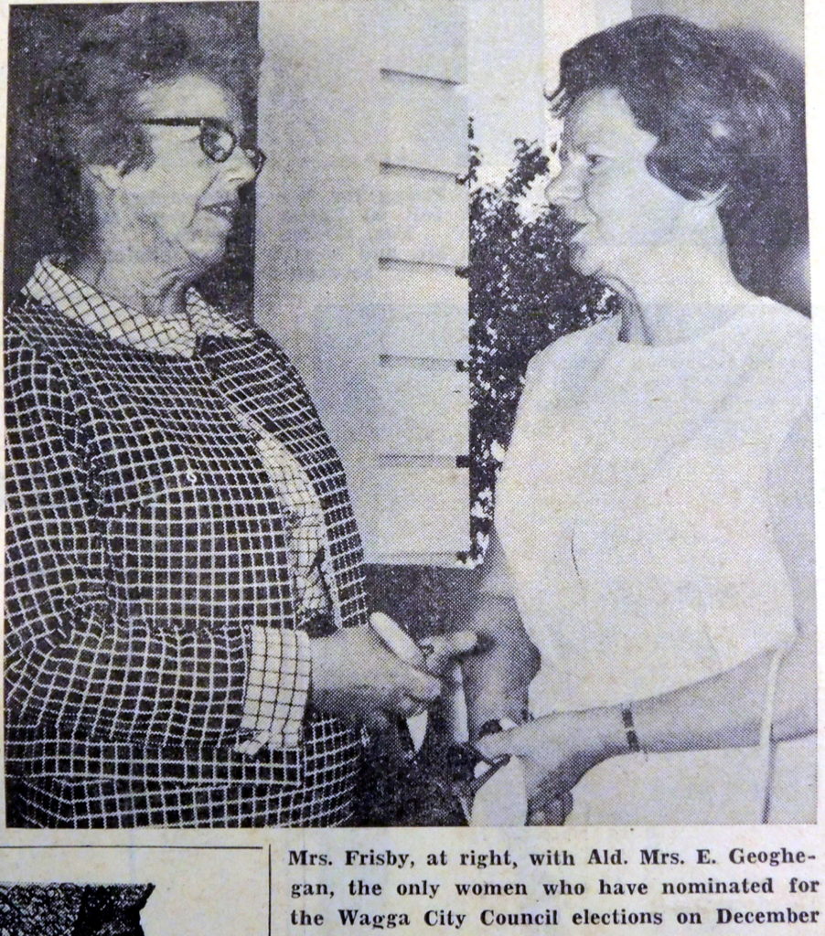 - Helen Frisby and Ald E Geoghegan are the only women to nominate for upcoming Wagga City Council elections.