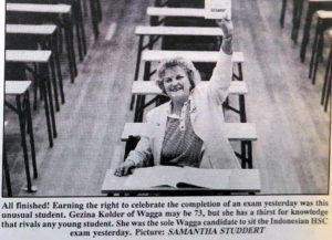 - Gezina Kolder, aged 73 who says “you can never be too old to learn” was the sole Wagga student to sit the HSC Indonesian exam.