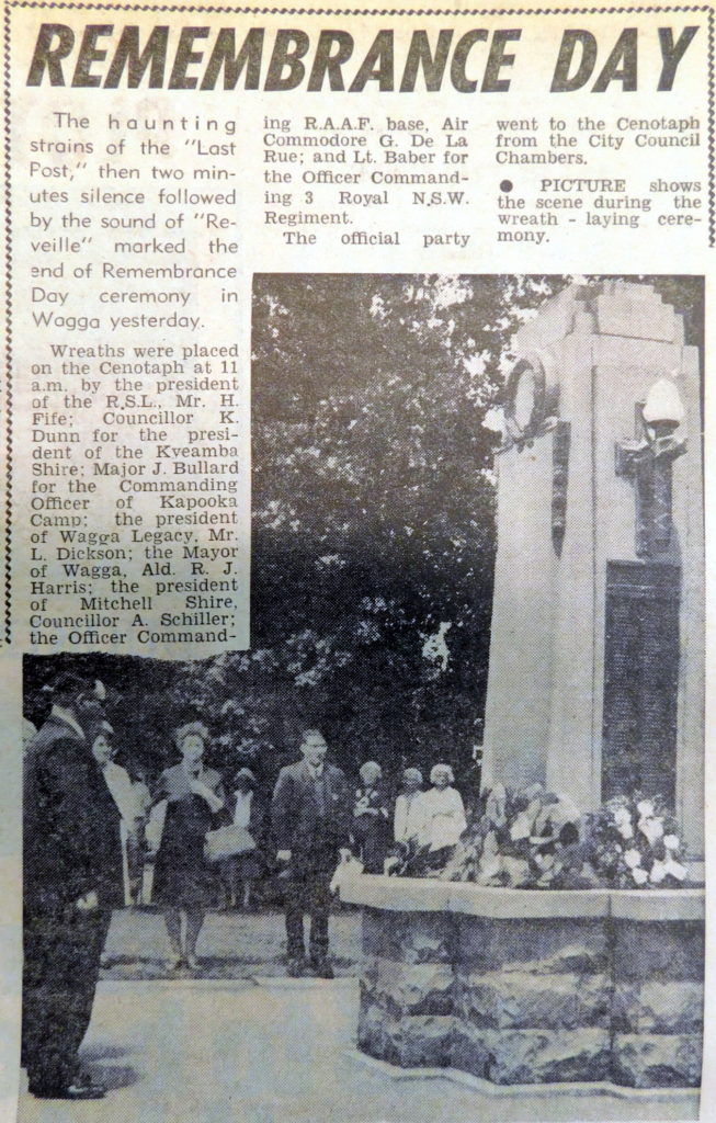 - Wreaths were placed on the Cenotaph by President of the Wagga RSL, Mr H Fife and representatives of many other organisations during the annual Remembrance Day ceremony.