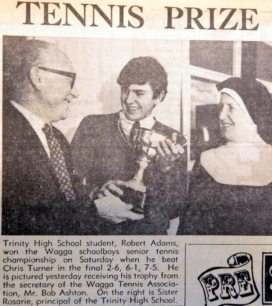 - Bob Ashton, Secretary of the Wagga Tennis Association presented the Wagga schoolboys senior tennis championship trophy to Robert Adams from Trinity High School.