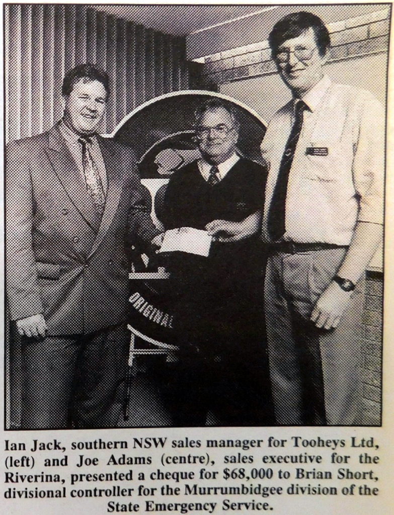 - Tooheys Ltd represented by sales executive, Joe Adams and sales manager Ian Jack presented a cheque for $68,000 to Brian Short, divisional controller from the Murrumbidgee division of the State Emergency Service.