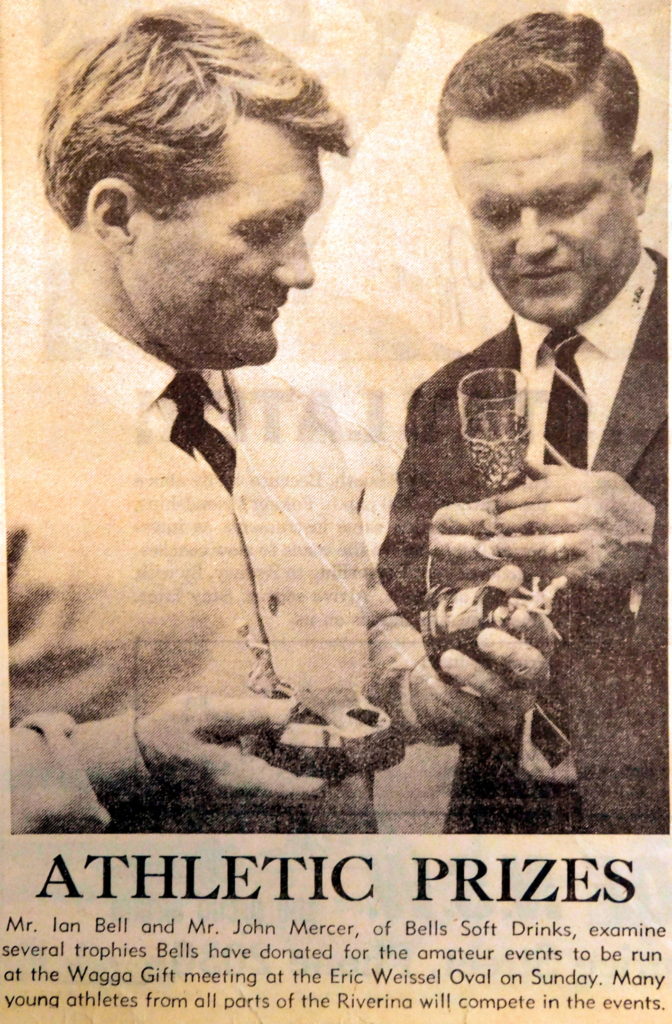 - Ian Bell and John Mercer of Bells Soft Drinks are pictured in the Daily Advertiser with trophies donated by Bells for the Wagga Gift meeting to be run this week at the Eric Weissel Oval.