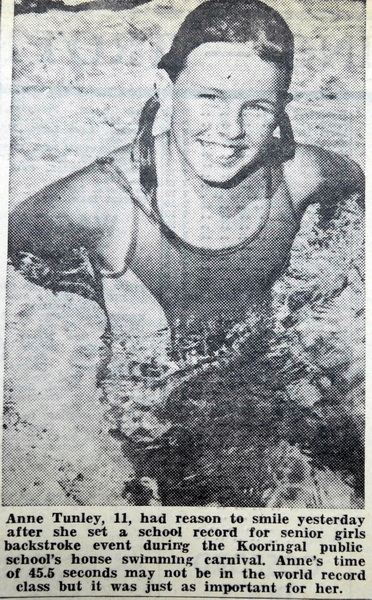 - Anne Tunley, 11, set a school record in the senior girl’s backstroke event during the Kooringal Public School’s house swimming carnival.