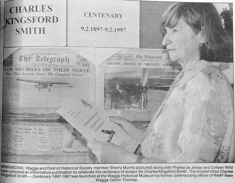 - Wagga and District Historical Society members, Sherry Morris and Phyliss de Jersey have compiled an informative booklet titled Charles Kingsford Smith – Centenary 1897-1997 which was launched by former commanding officer at RAAF Base Wagga, Cedric Thomas.