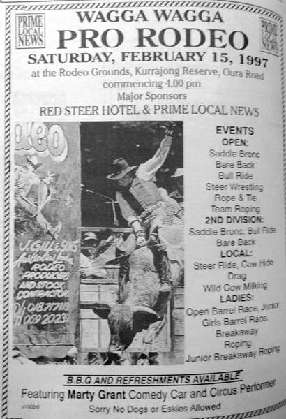 - The Wagga Pro Rodeo was held at the Rodeo Grounds at Kurrajong Reserve on the Oura Road.