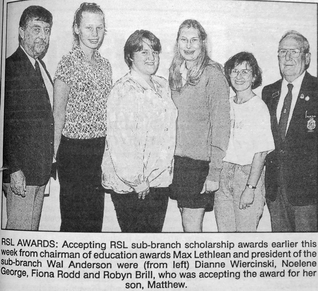 - RSL sub-branch scholarship awards were presented by Max Lethlean and Wal Anderson to Dianne Wiercinski, Noelene George Fiona Rodd and Robyn Brill who was accepting the award on behalf of her son, Matthew.