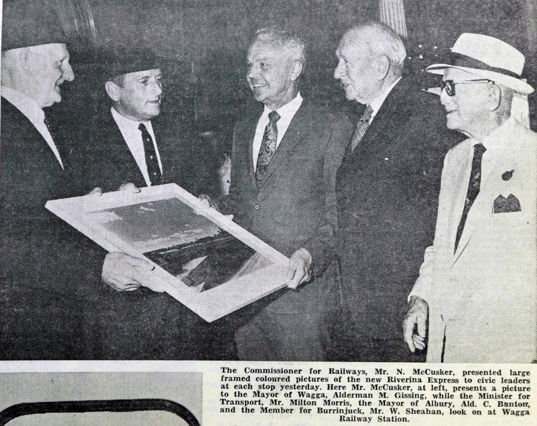 - The new Riverina Express was met on its inaugural journey at the Wagga Railway Station by Wagga’s Mayor, Alderman M Gissing, and others.