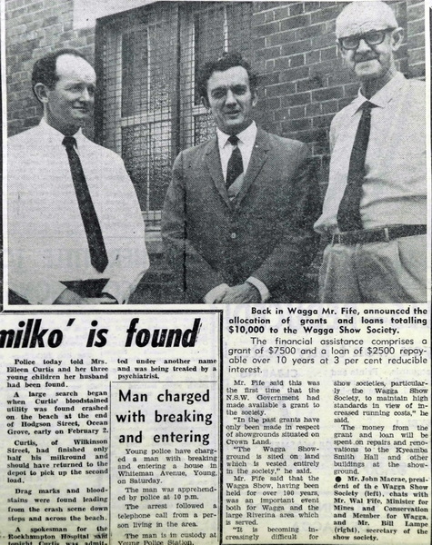 - Local member, Wal Fife announced a grant of $7500 and a loan of $2500 to the Wagga Show Society, the first time that the NSW Government had made a grant available to the Society.