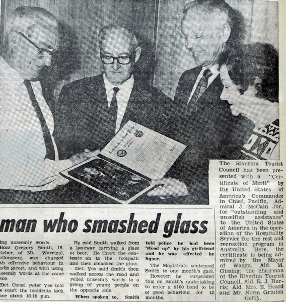 - The Riverina Tourist Council was presented by the United States of America Commander in Chief, Pacific with a “Certificate of Merit” for “outstanding and unselfish assistance” provided for their rest and recreation program.