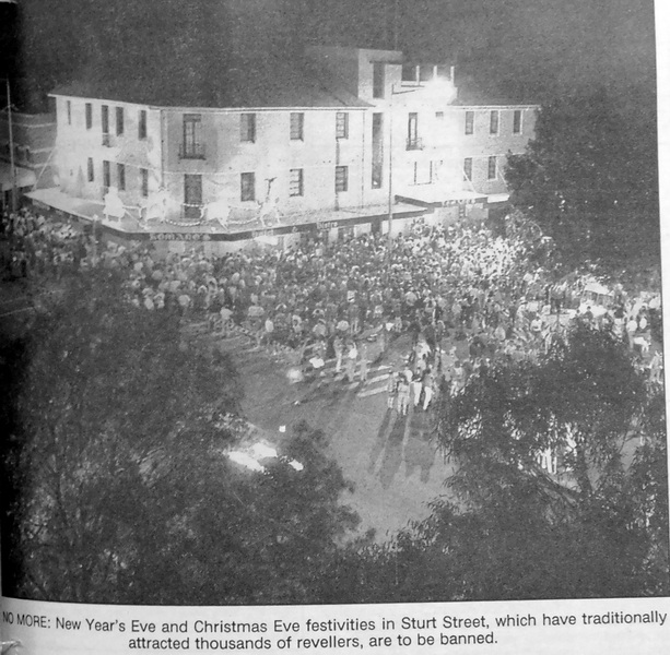 - New Year’s Eve and Christmas Eve festivities in Sturt Street are to be outlawed following consideration by a working party made up of senior police, Member for Wagga, Joe Schipp, Mayor Peter Dale, and representatives of the Chamber of Commerce, PCYC, AHA and Wagga media.
