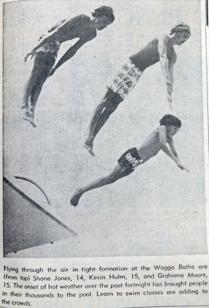 - Shane Jones, Kevin Hulm and Graham Moore are pictured in the Daily Advertiser diving in formation at the Wagga Baths.