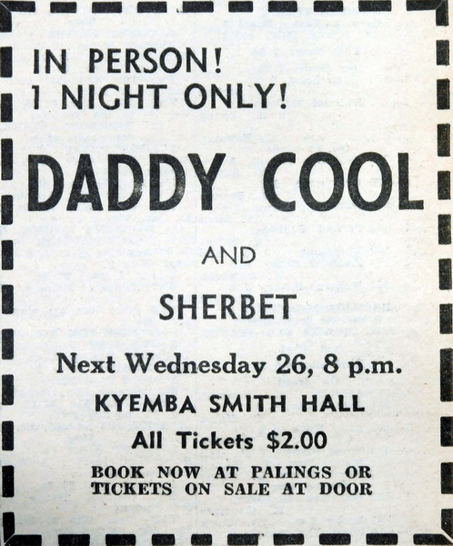 - Daddy Cool and Sherbet are playing next week at the Kyeamba Smith Hall.