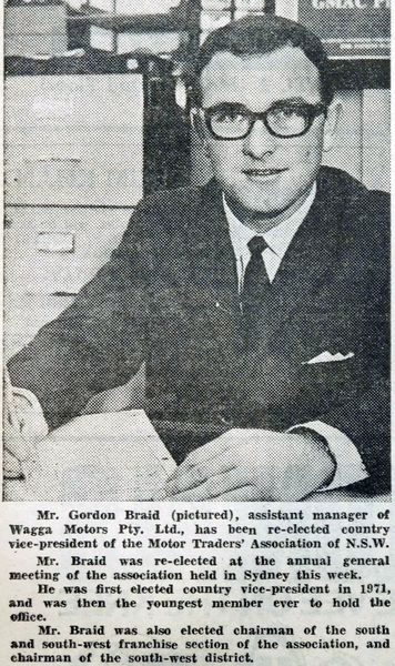 - Gordon Braid, assistant manager of Wagga Motors Pty Ltd has been re-elected country vice-president of the Motor Traders Association of NSW.