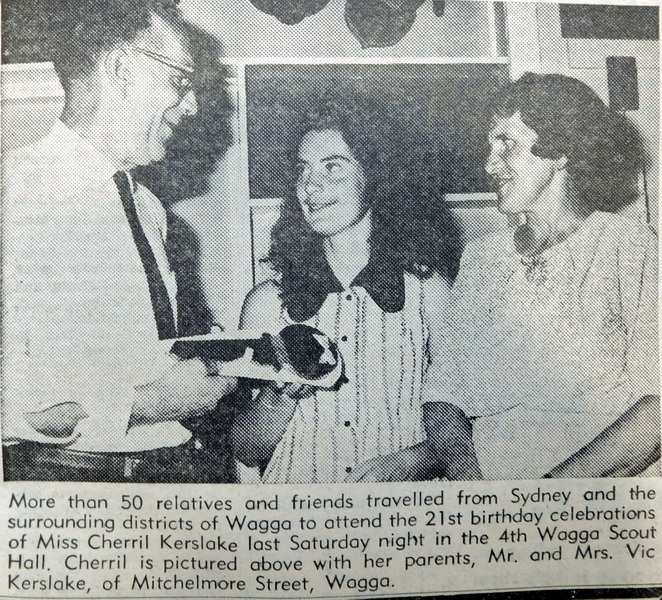 - More than 50 relatives and friends attended the 21st birthday celebrations of Miss Cherril Kerslake at the 4th Wagga Scout Hall.
