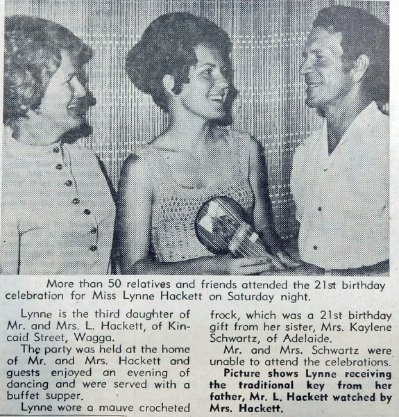 - More than 50 relatives and friends attended the 21st birthday celebration of Miss Lynne Hackett at the Kincaid Street home of her parents, Mr and Mrs L Hackett.
