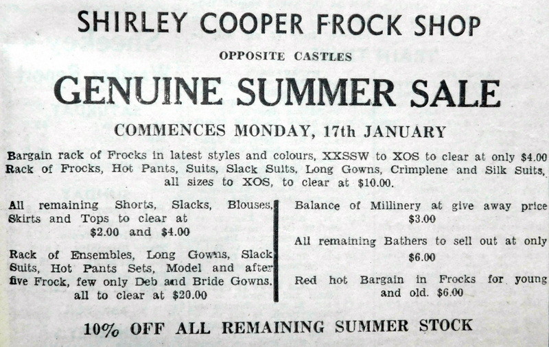 - Shirley Cooper Frock Shop “Genuine Summer Sale” includes frocks from $4 and all remaining shorts, slacks, blouses, skirts, and tops to clear at $2 to $4.