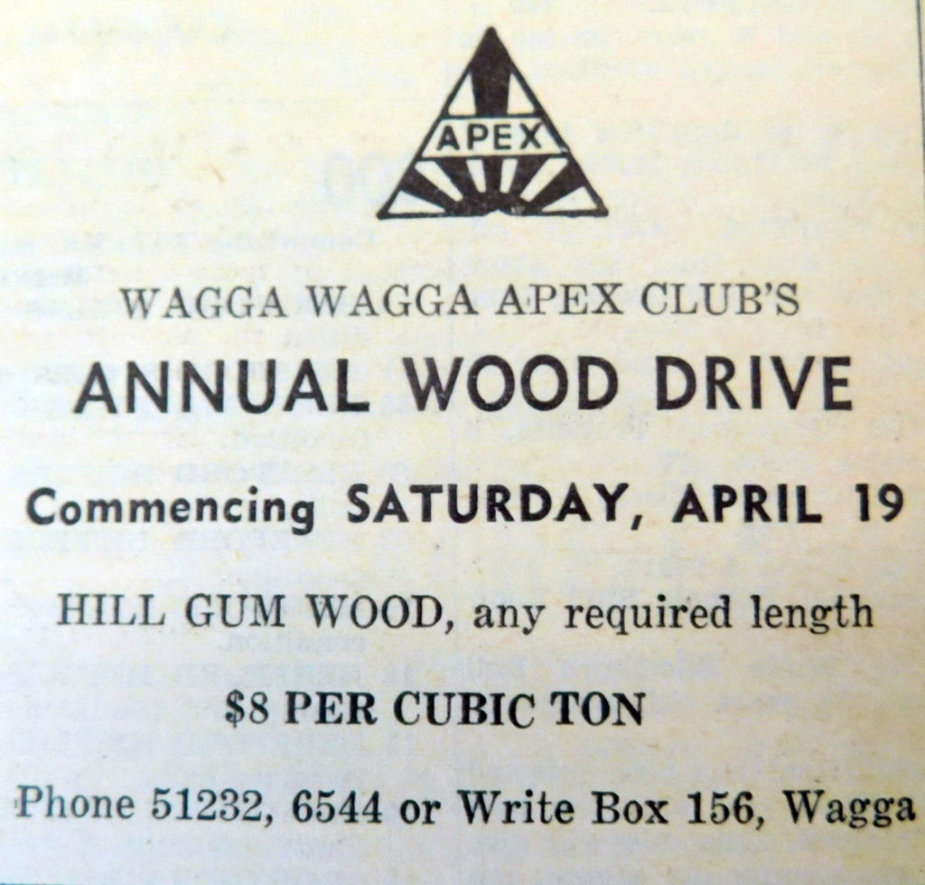 - The Wagga Apex Clubs’ Annual Wood Drive will commence soon with hill gum wood for $8 per cubic ton.