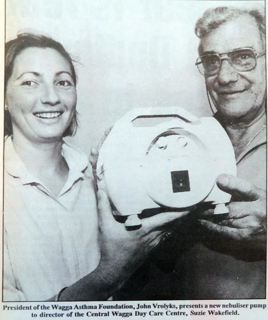 - John Vrolyks, President of the Wagga Asthma Foundation presented a new nebuliser pump to Suzie Wakefield, director of the Central Wagga Day Care Centre.