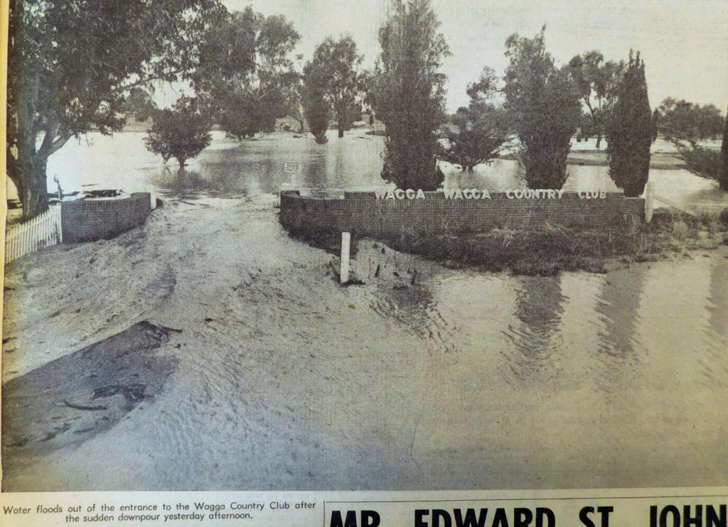 - Water flooded the road entrance to the Wagga Country Golf Club after a cloudburst of two inches within half an hour.
