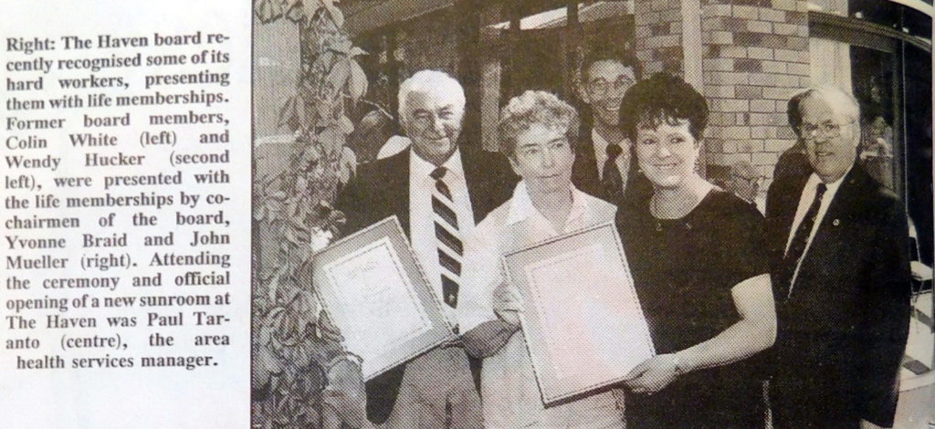 - John Mueller and Yvonne Braid, co-chairs of the Haven board presented life membership to former board members, Colin White and Wendy Hucker.