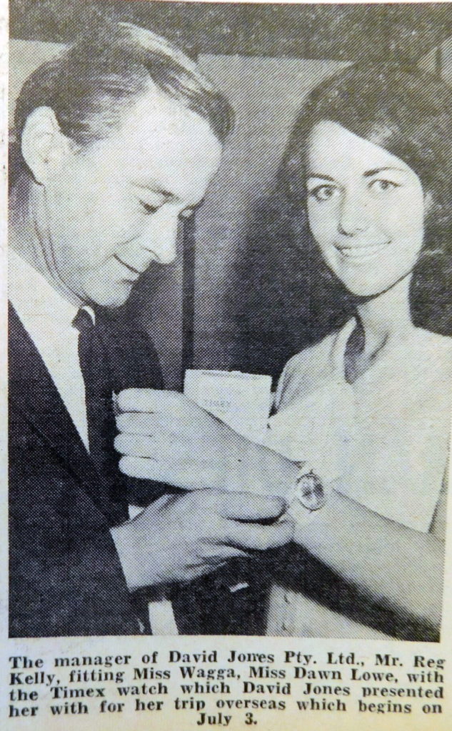 - Manager of David Jones, Mr Reg Kelly presented Miss Wagga, Miss Dawn Lowe with a Timex watch for her trip overseas.