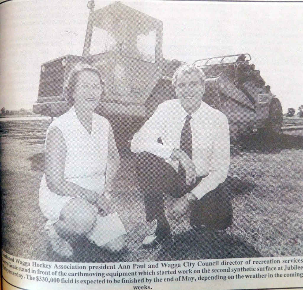 - Hockey Association president, Ann Paul and Council director of recreation services, Kerry Geale are pictured in the Daily Advertiser at Jubilee Park as work begins on the second synthetic surface there at a cost of $330,000.