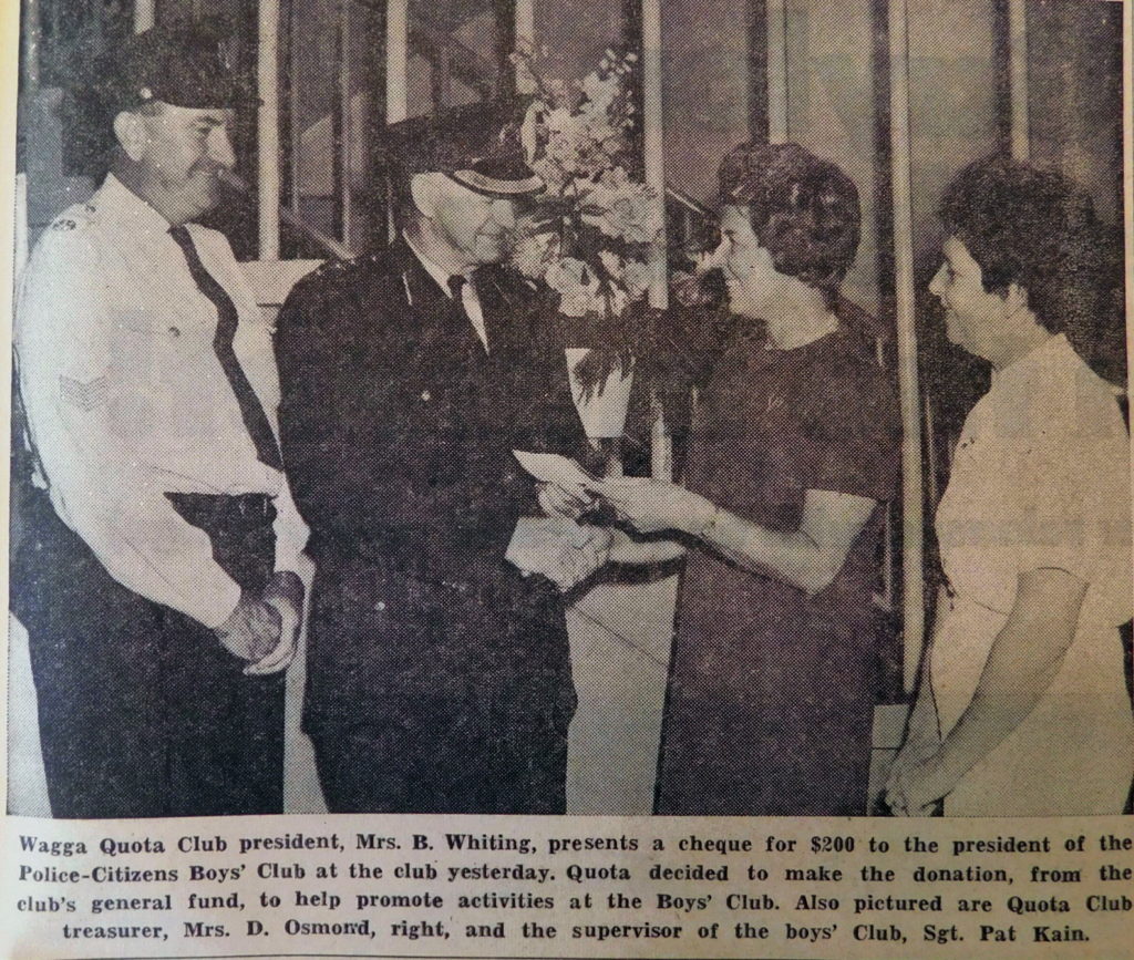 - Wagga Quota Club President, Mrs B Whiting and Treasurer Mrs D Osmond presented a cheque for $200 to Police-Citizens Boys’ Club supervisor, Sgt. Pat Kain.