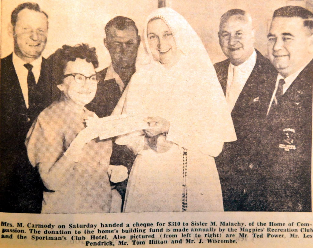 - Mrs. M Carmody presented a cheque for $310 on behalf of the Magpie’s Recreation Club and the Sportsman’s Club Hotel to Sister M Malachy for the Home of Compassion building fund.