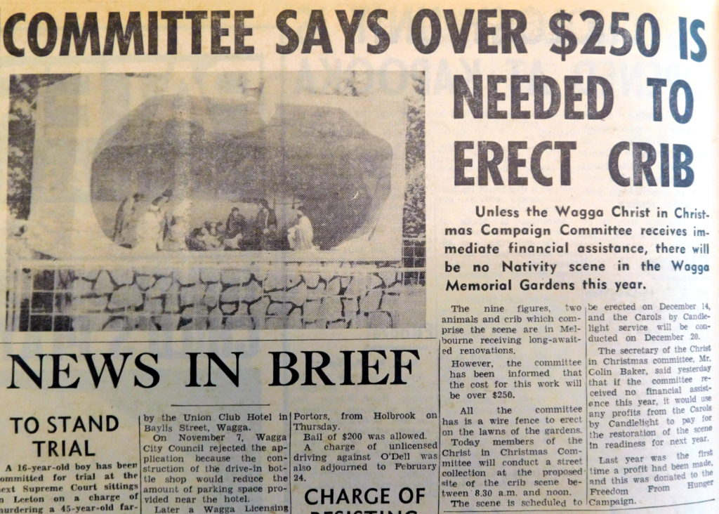 - Secretary of the Christ in Christmas committee, Colin Baker said that unless the committee received immediate financial assistance there would be no Nativity Scene in the Wagga Memorial Gardens this year.