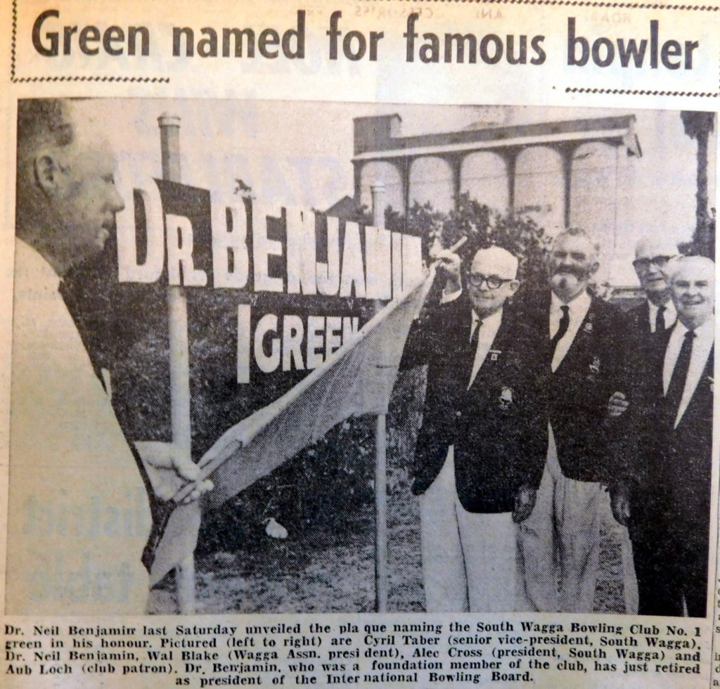- Dr. Neil Benjamin unveiled a plaque naming a South Wagga Bowling Club Green in his honour in the presence of Wal Blake, Wagga Association president, Alec Cross, South Wagga president, Aub Loch, club patron, and other officials.
