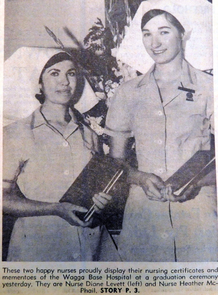 - Nurses, Diane Levett, and Heather McPhail are pictured in the Daily Advertiser proudly displaying certificates after their graduation at Wagga Base Hospital.