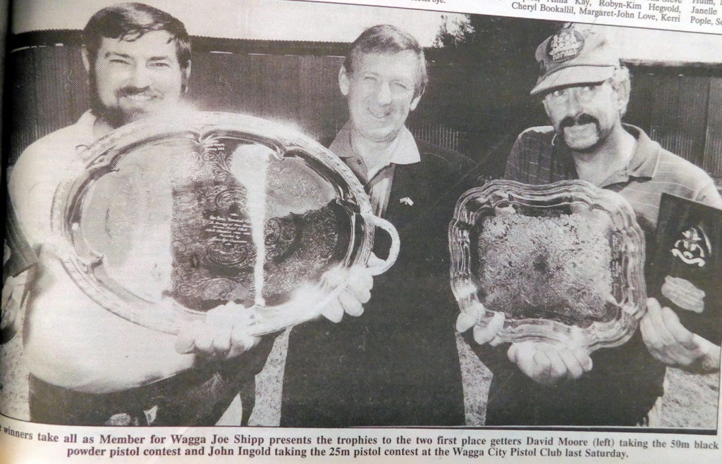 - Member for Wagga, Joe Schipp MP presented trophies to David Moore and John Ingold, who were the first two placegetters at the Wagga City Pistol Club contest.