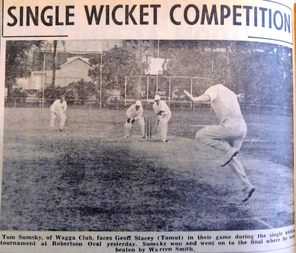- Tom Sumsky defeated Geoff Stacey but was in turn defeated by Warren Smith in the single wicket cricket tournament at Robertson Oval.