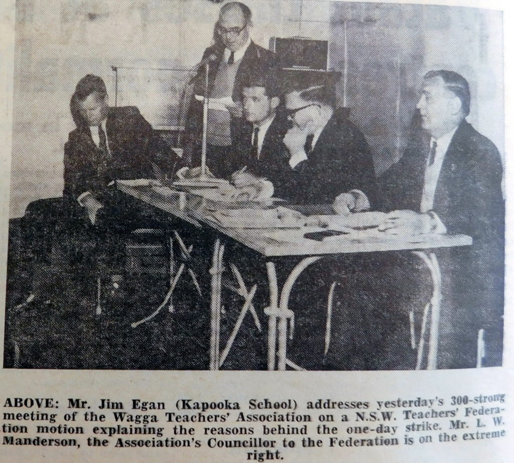 - Most of Wagga’s 300 teachers went on strike, attending a protest meeting at the Old RSL Hall.