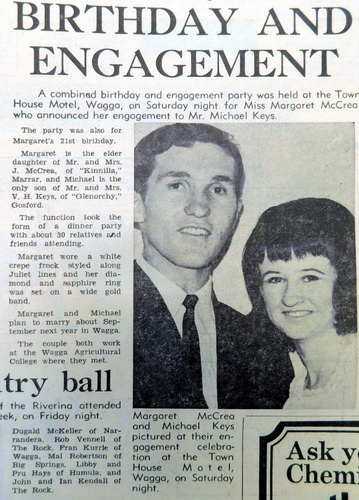 - A combined 21st Birthday and engagement party was held at the Town House Motel for Miss Margaret McCrea who announced her engagement to Mr Michael Keys.