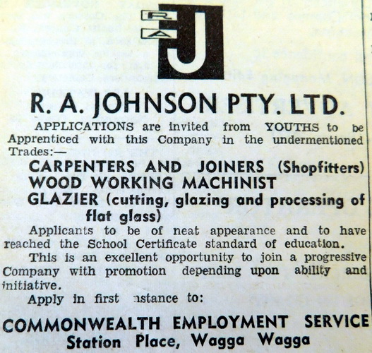 - R. A. Johnson Pty Ltd is seeking youths with School Certificate qualifications to undertake apprenticeships as Shopfitters, Wood Working Machinists or Glaziers.