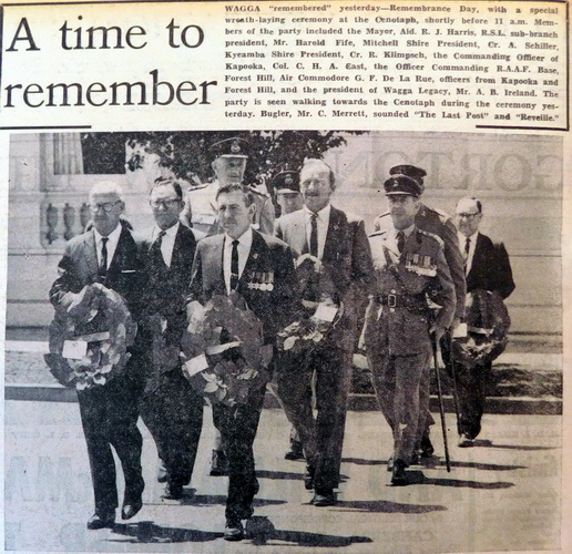 - A special wreath-laying ceremony led by Wagga’s Mayor, Ald R J Harris and with a bugler, Mr C Merrett sounding the “Last Post “and “Reveille” was held at the Cenotaph for Remembrance Day.