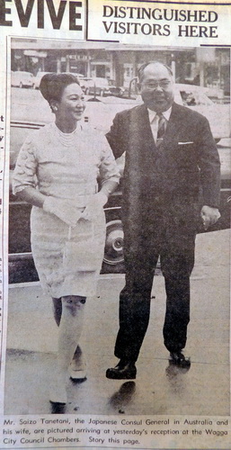 - Japanese Consul General Mr Tanetani who was in Wagga for the crowning of Miss Wagga was tendered a Civic Reception with speeches of welcome from Ald Harris, Ald Geoghegan, Mr H J McPherson MLC and Mr Neville Rava, chairman of the Community Advancement Fund.