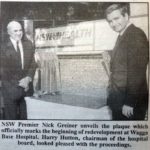 Twenty five years ago NSW Premier, Mr Nick Greiner, pictured here with Hospital Board Chairman, Harry Hutton “ended speculation” over the future of Wagga Base Hospital by unveiling a plaque to mark the start of its $15 million stage one redevelopment.