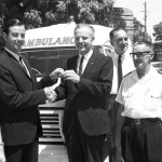 President of Wagga Apex Richard Gray and past president David Kennedy in January 1969 presenting the keys for a new ambulance to Morris Gissing, chairman of the Murrumbidgee Ambulance Committee and Ambulance Superintendent Len Rees. Picture: CSURA RW1574