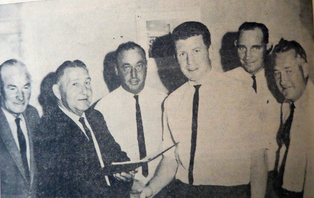 He is pictured here with officials of the the Kangaroos Club soon after signing a contract to coach the club for three years. With him are Mr F Murphy (Kangaroo’s vice-president), Mr A French (treasurer), Mr M Kelly (president), Mr Kennedy, Mr L Elliott (assistant secretary) and Mr W Williams (secretary).