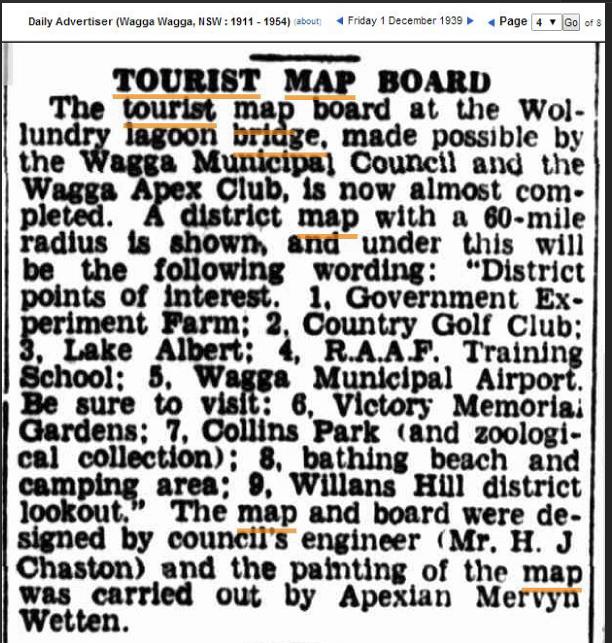 The sign was first erected in 1939 by Council with the assistance of Wagga Apex Club.